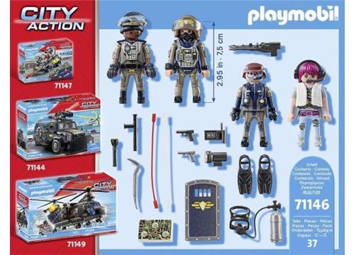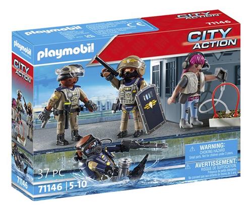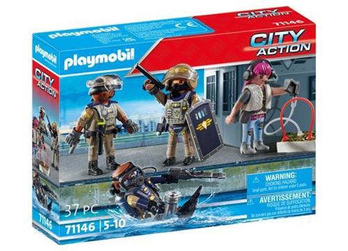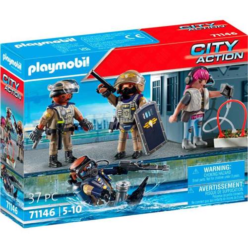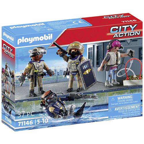 De Tactical Unit-speciale team staat altijd klaar wanneer de PLAYMOBIL-politie extra ondersteuning nodig heeft. De politie speelgoedset bevat alles wat junior politieagenten nodig hebben om een snelle reactie-eenheid op te zetten, zoals een Tactical Unit duiker, een operationeel coördinator en een Task Force-officier. Met hun speciale uitrusting zit het team de voortvluchtige op de hielen. Misdaad maakt geen kans tegen deze slimme task force! Met rijk uitgeruste gebouwen, coole voertuigen en inspirerende personages stimuleert de PLAYMOBIL City Action-serie creatief rollenspel. Productdetails: 37-delige politie figuurset met vier PLAYMOBIL-figuren, drie Tactical Unit-task forces en een vrouwelijke crimineel, duiktank, helm, GPS, breekijzer en talrijke speciale uitrusting voor actievolle achtervolgingen in de kinderkamer. Helmen, handschoenpatches, vinnen, duiktank en armboeien zijn verwijderbaar De speciale uitrusting (pistool, breekijzer en zaklamp) kan worden bevestigd aan de riemclips van de figuren
