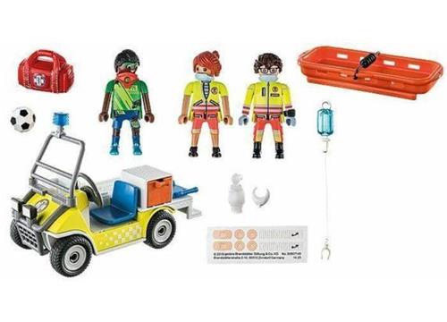 Met de innovatieve reddingswagen is het reddingsteam snel ter plaatse om de geblesseerde voetballer te behandelen. Inclusief brancard en voldoende opbergruimte voor voorraden. Afmetingen: 15 x 8 x 11 cm (LxBxH) Op naar de reddingswagen en aan de slag! De wendbare wagen is razendsnel op de plaats van een ongeval, zelfs op ruw terrein. Dit keer was er een noodgeval op het voetbalveld. Het reddingsteam in de wagen nadert snel de geblesseerde persoon. De voetballer liep een nekblessure op, dus wordt eerst een steuntje om zijn nek gedaan ter stabilisatie. Daarna tillen de ambulancebroeders de speler voorzichtig op de brancard en vervolgens op de wagen. Ze gaan snel naar het ziekenhuis voor verder grondig onderzoek. De speelgoedset bevat 3 PLAYMOBIL-figuren, een reddingswagen, brancard, EHBO-doos, infuusset en vele andere extra's voor spannende reddingsoperaties in de kinderkamer. Patiënten kunnen liggend op de reddingsbrancard op de wagen worden vervoerd. Met de meegeleverde pleisteretiketten zijn wonden in een mum van tijd behandeld. De PLAYMOBIL City Life-serie omvat moderne voertuigen en realistische modellen waarmee kinderen zich kunnen onderdompelen in spannende rollenspellen.