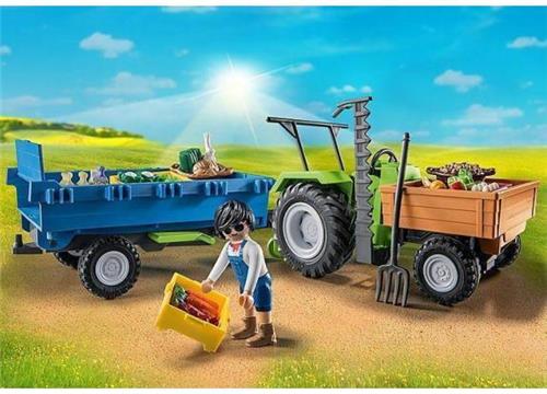 Tractor met aanhanger. De tractor met aanhanger transporteert de vers geoogst groenten naar de 24-uurs winkel. Met groot laadvlak dat voor het ontladen naar voren kan worden gekanteld. Help de boer bij het veldwerk met de coole tractor met aanhanger van PLAYMOBIL. Met zijn realistische functies zoals de kantelbare laadbak en de grote banden biedt de groene tractor een creatieve speelervaring. Fruit en groenten worden vers van het veld geoogst en in de transportboxen geplaatst en naar de 24-uurs winkel gebracht voor verkoop.
