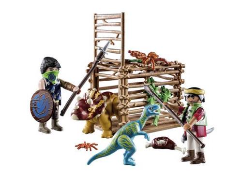 Met behulp van de Velociraptor probeert Ian de Triceratops-baby uit de kooi te bevrijden. De dino's zijn los in PLAYMOBIL Dino Rise! Samen met hun dinosaurussen overwint Team Dino Rise elke uitdaging. Samen met hun Velociraptor proberen Ian en Milow de Triceratops-baby uit zijn benarde situatie te redden. Met gecombineerde dino-menskracht zullen ze zeker slagen. Beide dinosaurussen kunnen in de val worden gelokt door de grendel te verplaatsen. Met originele personages, indrukwekkende dinosaurussen en moderne uitrusting biedt de Dino Rise-speelwereld van PLAYMOBIL volop materiaal voor actievolle speelavonturen in de kinderkamer. Een ideaal cadeau of souvenir voor dinofans vanaf 4 jaar. PLAYMOBIL Starter Packs zijn de ideale introductie tot het grote kleurrijke PLAYMOBIL-universum. De set bevat twee PLAYMOBIL-figuren, Ian en Milow, twee speelgoeddinosaurussen, een Velociraptor en een baby Triceratops, een reuzenspin, een dino-kooi en vele andere coole extra's voor spannend dinosaurus-speelplezier.