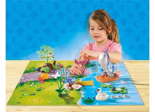 Vandaag is een mooie dag! De zon schijnt volop en een vlinder fladdert vrolijk rond. De blauwe waterfee brengt net een bezoekje aan haar goede vriendin. Daar komt ze al aan in haar feeënboot over het meer vol waterlelies, begeleid door een schattige zwanenfamilie. Haar vriendin begroet haar vrolijk aan de oever en zwaait met haar feeënstaf. Eindelijk hebben ze weer tijd om uitgebreid bij te kletsen. Met de volledig nieuwe PLAYMOBIL® Play Maps heb je altijd een grote, kleurrijke speelmat bij je. Vouw deze open, pak de figuren en toebehoren uit en ga lekker spelen. Dankzij de coole riemclip kun je alles ook weer heel gemakkelijk in het mapje opbergen en meenemen.