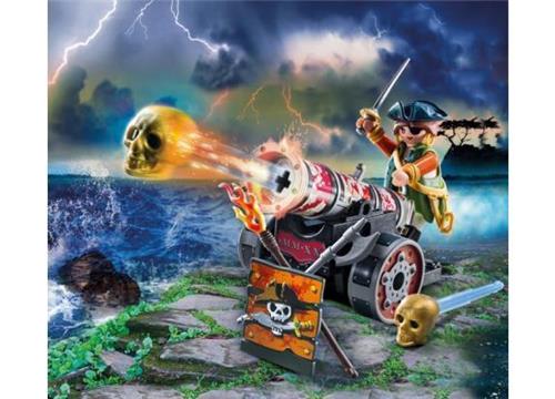 | Verpakkingsinhoud | De speelset bestaat uit een kanon met doodskopkogel, een PLAYMOBIL-piratenfiguur met hoed, sjerp en manchetten en nog meer extra's. |