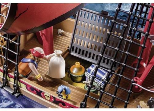 | Verpakkingsinhoud | De speelset bestaat uit een piratenschip, drie PLAYMOBIL-figuren, een slingeraap, een papegaai en twee ratten. Het schip kan drijven en kan worden uitgebreid met een RC-onderwatermotor (9853). Voor flexibele tochten in de kinderkamer is de scheepsromp voorzien van wieltjes, zodat het schip probleemloos over de vloer kan worden verplaatst. |