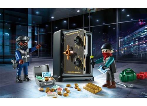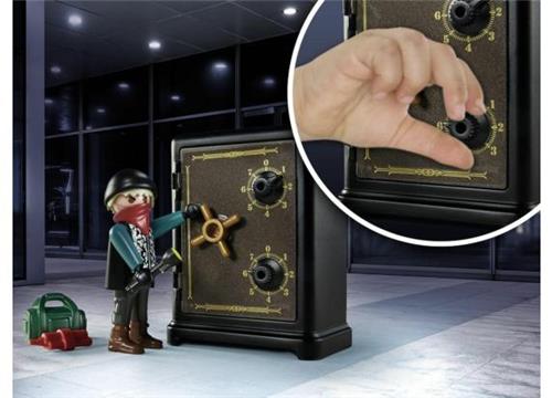 Een dief zit achter de bankkluis aan. Met een koevoet wist hij de kluis open te breken en nu tilt hij haastig het geld in een koffer. Maar hij was niet snel genoeg want plotseling werd hij verrast door een politieagent. Nu worden eerst de handboeien omgedaan en dan is het op naar het politiebureau. PLAYMOBIL Starter Packs zijn ideaal als start of aanvulling op de vele kleurrijke PLAYMOBIL speelwerelden. De set bevat een politieagent en een dief, een kluis, goudstaven, een geldkist, twee pakken dynamiet, een koevoet en vele andere extra's. De kluis kan alleen worden geopend als met de draaischijven de juiste cijfercombinatie is ingesteld. De kluis is ook te gebruiken als spaarpot.