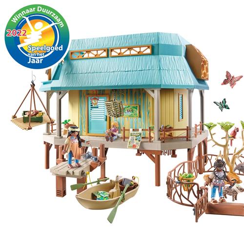 Het dierenverzorgingsstation met twee verdiepingen ligt langs de rivier. Hier worden de inheemse dieren verzorgd. Het station is te bereiken via trappen of aan de rivierzijde via een loopbrug. Het station is goed uitgerust voor de verzorging van de dieren en heeft een behandelkamer met een tafel, beweegbare chirurgische lamp, weegschaal, warmtelamp en verlichte monitor voor het bekijken van röntgenfoto's. Een ladder leidt naar de zolder van het station. Daar wordt voedsel opgeslagen en apparatuur voor insectenonderzoek is beschikbaar. Na een succesvolle behandeling kunnen twee recreatie buitenverblijven door de dieren worden gebruikt. Momenteel wordt daar een familie tapirs en een ocelot gehuisvest. Zodra de dieren weer gezond zijn, worden ze vrijgelaten in de natuur. Deze gedetailleerde speelset neemt kinderen mee naar de fascinerende wereld van de Amazone.