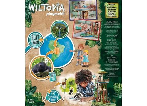 Krijg het extra portie kennis De Wiltopia-webapp biedt extra audio- en videocontent en neemt kinderen mee naar de leefomgeving van de dieren. Scan eenvoudig de QR-code op de dierenkenniskaart en de gedetailleerde dieren- en plantenwereld komt bij je thuis. Gebruik de coole AR-functie om een selfie te maken met de brulaap. Ontdek vermakelijke kennisoverdracht met plezier en leereffect. Wiltopia - Prachtig voor het milieu Wiltopia is de eerste PLAYMOBIL-productlijn die is gemaakt van gemiddeld meer dan 80% duurzaam materiaal. Afgedankt plastic afval krijgt een nieuw leven en dient als materiaalbron voor deze bijzondere speelwereld. Dit spaart hulpbronnen en vooral het milieu. Uiteraard voldoen alle producten van Wiltopia aan de gebruikelijke hoge veiligheidsnormen en de bewezen PLAYMOBIL kwaliteit en duurzaamheid.