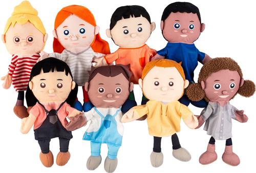 Een set van 8 handpoppen van Educo met afmetingen passend bij de kinderhand. De poppen hebben een lengte van ongeveer 20 cm. Iedere pop heeft een eigen uiterlijk en karakter. Dit bevordert het spel en het bewust zijn van, en het omgaan met diversiteit. Om het spel nog aantrekkelijker te maken, is het poppentheater hierbij te gebruiken (apart verkrijgbaar).