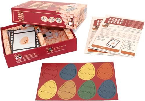 Poule Poule kaartspel. Kies eerst een speler als regisseur, de "Poule-poule Master" (PPM). De PPM daait een-voor-een de kaarten open in het midden van de tafel. Eenmaal geplaatst, vormen deze kaarten de Film. Ondertussen moeten de andere spelers alleen de eieren tellen! In het eerste spel bestaat het deck uit: 15 eieren, 10 kippen en 10 vossen. Je telde 5 eieren? Sla op de tafel en roep Poule-Poule! De speler die als eerste op de Film slaat als deze ten minste 5 eieren bevat, verdient 1 punt. Elk deel van een gekleurd ei vertegenwoordigt een punt. Een volgende ronde kan beginnen! De eerste speler die 3 punten verdient - degene die als eerste een compleet gekleurd ei heeft - wint het spel. Een speler is het hier niet mee eens? Vraag om een slow motion! Als een speler op de Film slaat, kunnen de andere spelers ermee instemmen, en op de spelers hand slaan, of niet slaan, als ze het er niet mee eens zijn. Alleen als ten minste een speler niet slaat, bekijken we de Film in slow motion. De PPM draait de Filmstapel om - zonder de volgorde te veranderen - en speelt daarna de Film opnieuw af, kaart-voor-kaart, te beginnen met de bovenste kaart (die als eerste gespeeld werd), maar ditmaal in slow motion ... Alle spelers die het niet eens zijn met de speler die als eerste sloeg - verdienen 1 punt als ze gelijk hebben (na de slow motion blijken er minder dan 5 beschikbare Eieren te zijn), of - verliezen 1 punt als ze het fout hebben (er waren minimaal 5 Eieren beschikbaar).