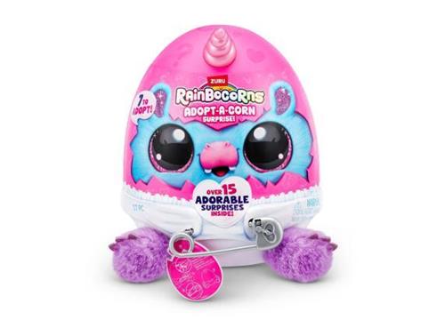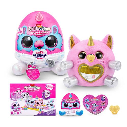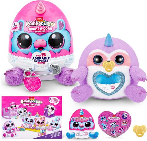 Maak kennis met de schattige Rainbocorns Adopt-A-Corn Surprise van ZURU! Deze gloednieuwe besties zijn op zoek naar een liefdevol huis in Rainboville, en jij kunt hun nieuwe eigenaar worden. Elk ei zit boordevol meer dan 15 verrassingen, waaronder schattige pel-en-vertelhartjes onder een speciale laag en een liefdevolle verzorging met een speen.