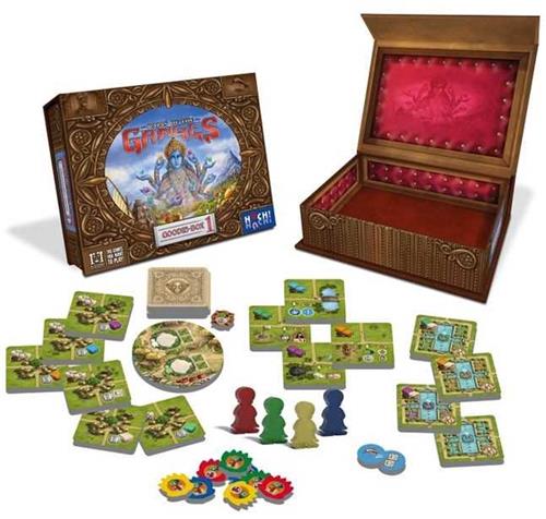 Met de Rajas of the Ganges - Goodie Box 1 breid je jouw basisspel van Rajas of the Ganges uit met diverse mini-uitbreidingen en modules. Deze coffer bevat 3 Ganges modules die eerder zijn uitgebracht als onderdeel van de "Brettspieladventskalender" (Bordspel Adventskalender) en de "Deutsche Spielepreis Goodie Box": Mango Village, Shalimar Gardens (Snake Expansion) en Tiger Expansion. Bovendien heb je de beschikking over de modules The Test of Fate en The Gemstone Trader, evenals 2 nieuwe tegels voor zowel Mango Village als voor de rivier. Alle modules zijn onderling compatibel.