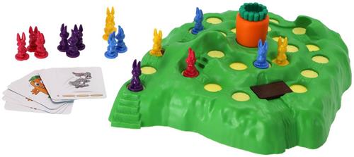 Onze kleine Bunny Hop konijnen doen een wedstrijd om de sappige wortel bovenop de berg. Maar de weg daar naar toe is vol verrassingen: de ene keer vallen er gaten in de weg en - plop - valt één van de konijnen erin, de andere keer worden ze door een betweterige mol brutaal van het bord gegooid. Ook een ophaalbrug en een hek versperren de konijnen de weg naar het doel. Wie het eerst de wortel bereikt, heeft dit spel van Ravensburger gewonnen. Dit product is geschikt voor kinderen vanaf 4 jaar. Toezicht door volwassenen wordt voor dit product aanbevolen.