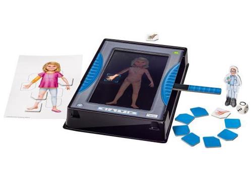 | Verpakkingsinhoud | 1 röntgenapparaat bestaand uit kunststof en karton (zonder elektronica) 1 onderzoekstaaf 4 filmpjes met een lichaam 31 lichaamsdeel-schijfjes 1 aflegbord 1 speelfiguur met schoenenopzetvoetje 1 dobbelsteen 1 handleiding |