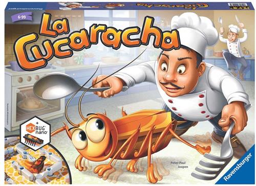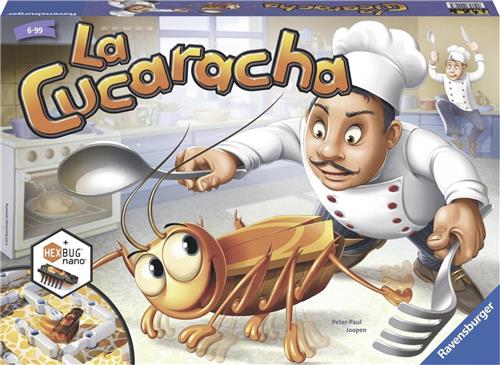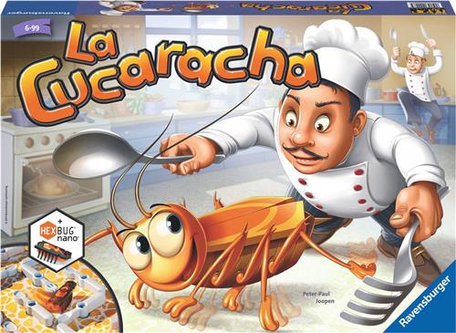 In La Cucaracha zijn de kakkerlakken weer! Vliegensvlug schiet er een door de keuken en jaagt iedereen de stuipen op het lijf. Nu geen tijd meer verliezen! Laat ze snel met behulp van het uitliggende bestek in jullie vallen lopen. De dobbelsteen geeft aan of je een vork, mes of lepel draaien mag. Goed kijken en snel reageren, daar draait het om. Wie slim het bestek draait, laat de kakkerlakken in de val lopen. Voor iedere kakkerlak die je vangt, krijg je een fiche en wie als eerste 5 fiches in de wacht gesleept heeft, wint de kakkerlakkenjacht. La Cucaracha is een spel van Ravensburger en bevat de originele HEXBUG® nano®.