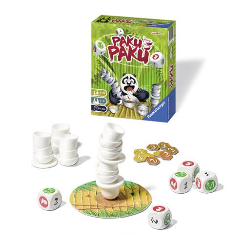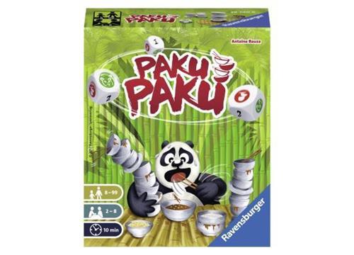 Ravensburger Paku Paku is het dobbelspel voor serviesacrobaten. Alleen degene die snel dobbelt en goed stapelt, kan dit razendsnelle dobbelspel winnen! Voor 2 - 8 hongerige panda's.