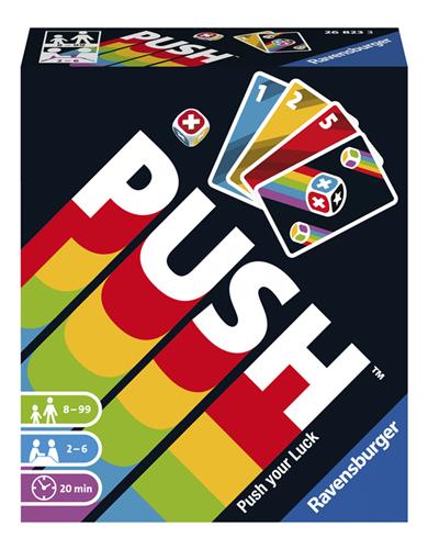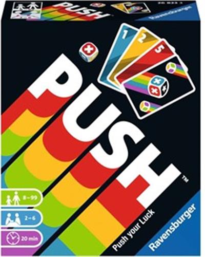 Zoek je spanning en sensatie? Stel je geluk dan op de proef bij het avontuurlijke kaartspel Push van Ravensburger. Risicovol of liever risicoloos? PUSH your luck ... maar niet te ver! In dit eenvoudig te leren en snelle kaartspel stellen 2 tot 6 spelers hun geluk op de proef en verzamelen de meest waardevolle kaarten om het spel te winnen. Aan het begin leggen de spelers alle kaarten in het midden van de tafel als een gesloten stapel en het spel kan beginnen. Als het jouw beurt is, draai je een willekeurig aantal kaarten van de trekstapel om en leg je ze in maximaal 3 rijen in het midden van de tafel. Met elke getrokken kaart worden de spelers geconfronteerd met de beslissing: meer punten blijven verzamelen, of op tijd stoppen en de beste rij kaarten pakken? Hoe hoger de kaartwaarden, hoe meer punten ze scoren aan het einde van het spel. Maar pas op - de andere spelers pakken de resterende rijen met kaarten! Als je echter besluit om te gokken, kun je te ver gaan. Zodra een kleur en / of een nummer dat al in de rijen staat wordt onthuld, is de beurt voorbij! De speler die te ver is gegaan, verzamelt geen rij. En het wordt nog erger! Als straf moet hij de dobbelsteen gooien en alle kaarten van de kleur uit zijn display op de aflegstapel leggen - en zo waardevolle punten verliezen die uiteindelijk kunnen beslissen of hij wint of verliest! De twee speciale kaarten in het spel zorgen voor speciale spanning. Als je een dobbelsteenkaart verzamelt, moet je ook de dobbelsteen gooien en kaarten uit je display verwijderen. Aan de andere kant beslissen kaarten om van richting te veranderen welke speler eerst een rij kaarten mag kiezen en een onverwachte wending mag nemen! Inhoud: 120 kaarten, dobbelsteen.