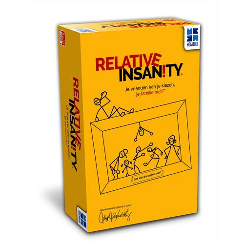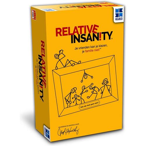 Megableu partyspel Relative Insanity. Met het Megableu partyspel Relative Insanity beleef je gegarandeerd een hilarische avond met vrienden of familie. Het spel draait om het maken van grappige zinnen en het raden van wie de zin heeft bedacht. Het spel bevat meer dan 500 kaarten met verschillende zinnen die je kunt combineren. Zo ontstaan er de meest absurde en grappige combinaties. Relative Insanity is geschikt voor 4 tot 12 spelers vanaf 14 jaar. Het spel is gemakkelijk te leren en zorgt voor veel lachmomenten. Ideaal voor een gezellige avond met vrienden of familie. Grappig en hilarisch partyspel - Geschikt voor 4-12 spelers - Bevat meer dan 500 kaarten met gekke zinnen.