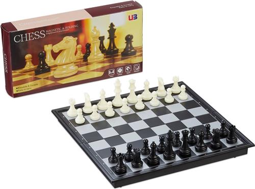 Afmetingen H x B x D: ca. 2,5 x 25 x 25 cm, Afmetingen ingeklapt H x B x D: ca. 4 x 12,5 x 25 cm, Gewicht: ca. 370 g, Materiaal: Kunststof, Kleur: Zwart, wit, grijs Inklapbaar schaakbord met stukken - Compact schaakbord ideaal voor op reis of onderweg - Inklapbaar bord met speelstukken aan de binnenkant - Heel wat denkpret voor klein en groot - Stukken blijven goed op hun plek dankzij magnetisch oppervlak - Klein schaakbord ideaal voor op reis of onderweg.