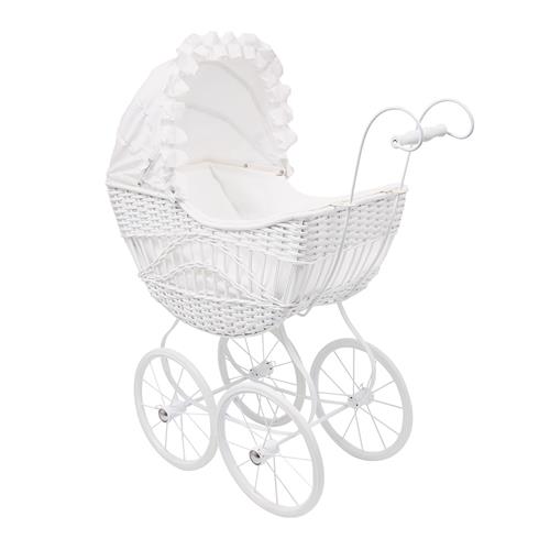 De poppenwagen heeft een glanzend wit metalen onderstel en is voorzien van een opvouwbare stoffenkap met speelse ruches, waardoor het een elegant ontwerp heeft. Met zijn spaakwielen en rubberen loopvlakken is deze poppenwagen zowel stijlvol als praktisch, en voorkomt het krassen op de vloer terwijl het geruisloos voort kan bewegen.