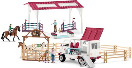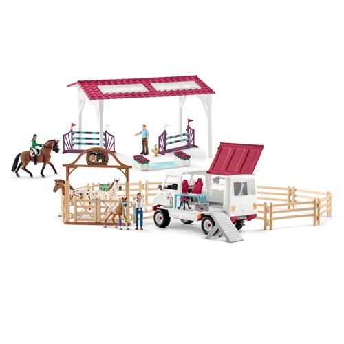 | Verpakkingsinhoud | 1x auto, 1x dierenarts, 1x dierenartsenset, 1x stethoscoop, 1x spuit, 1x medicatieflesje, 1x laptop, 1x röntgenapparaat, 1x paars zelfklevend verband, 1x halster, 1x tafel, 1x stoel, 1x receptblok, 2x stickervellen , 1x manegeoverkapping, 12x paddock, 1x poort, 1x ruiter, 1x rijinstructeur, 2x paarse verticale hekken, 1x gracht, 1x trofee, 1x Engelse volbloed hengst, 1x Appaloosa merrie, 1x Appaloosa ruin, 1x Appaloosa veulen, 1x montagehandleiding. |