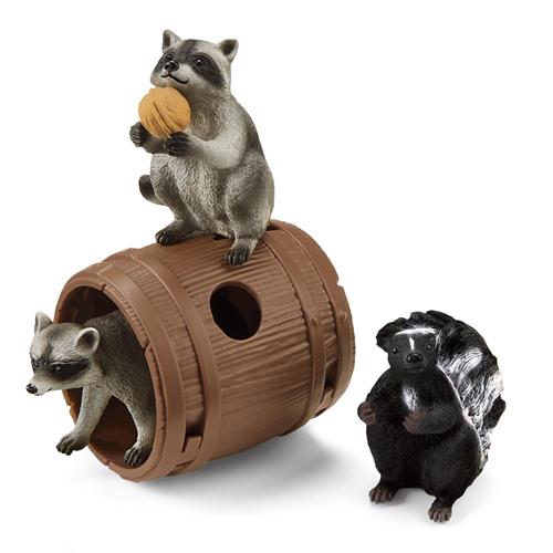 Met de Schleich® WILD LIFE speelfigurenset hebben kinderen urenlang speelplezier. Deze set draait helemaal om de wasbeer en het stinkdier die een avontuur beleven met een noot. Het stinkdier heeft de noot te pakken en verstopt deze snel in het houten vat. Maar tot zijn verrassing zit er al een ondeugende wasbeer op de noot te wachten in het vat! Het spel begint opnieuw en het is de vraag of het stinkdier de noot ooit terugkrijgt.