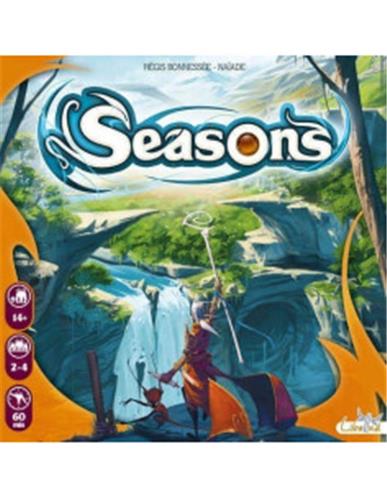 In het bordspel Seasons neem je als tovenaar deel aan een legendarisch toernooi over 12 seizoenen. Zorg dat je jouw kaarten het beste inzet en het toernooi wint, want dan ben jij de grootste tovernaar aller tijden. Seasons is een kaart- en dobbelspel dat plaatsvindt in twee fasen: de eerste bestaat uit een draft. Het doel tijdens deze fase is om een strategie te bepalen voor de rest van het spel met negen kaarten die kunnen worden geselecteerd (Elke kaart heeft een specifiek effect en levert overwinningspunten op). Zodra de draft is voltooid, moet elke speler zijn drie pakjes van 3 kaarten scheiden. Hij zal de tweede fase van het spel beginnen met zijn eerste pakje van drie kaarten, en geleidelijk aan naarmate het spel vordert, zal hij twee pakketten van drie kaarten ontvangen. Dan begint de tweede fase van het spel: aan het begin van elke ronde zal een speler de seizoensdobbelstenen gooien (1 dobbelsteen per speler + 1). Deze dobbelstenen bieden verschillende acties aan de spelers: - Verhoog je oproeping (maximaal aantal kaarten dat je op tafel mag hebben gelegd) - Energie oogsten (water, aarde, vuur, lucht) om de kosten van het oproepen van kaarten te betalen - Kristallisatie-energie (tijdens het huidige seizoen) om kristallen te verzamelen. Deze dienen zowel als een hulpbron voor bepaalde kaarten, maar ook als vele overwinningspunten in het eindspel. - Nieuwe kaarten trekken... Elke speler kan slechts één dobbelsteen per beurt kiezen. De eerste speler kiest uit de geworpen dobbelstenen, dan de volgende uit de resterende en zo verder. Bij elke beurt geeft de dobbelsteen aan hoeveel resterende vakjes (1, 2 of 3 vakjes) de marker van de seizoenen vooruitgaat. Bovendien zijn alle dobbelstenen verschillend afhankelijk van het seizoen. Bijvoorbeeld, er zijn niet dezelfde energieën voor een bepaald seizoen. Gedurende het spel zullen spelers zich daarom moeten aanpassen aan deze veranderingen. Aan het einde van het spel tellen we de overwinningspunten op de kaarten, gegeven het aantal kristallen in bezit. De speler met de meeste overwinningspunten wint.