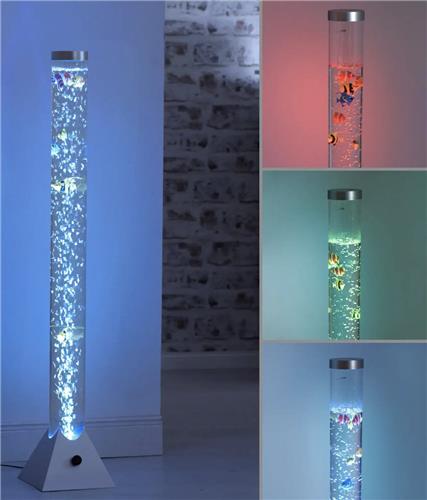 Deze opvallende Bellenbuis (120 cm lang en een diameter van 10 cm) met van kleur veranderende LED-verlichting is een betoverende toevoeging aan elk huis, kantoor of slaapkamer. Kleur veranderende lichten hebben de mogelijkheid om zowel volwassenen als kinderen te boeien en kunnen ook worden gebruikt voor educatieve doeleinden. Levering met kunststof vissen en kwallen deze zwemmen door de zuil. De vrijstaande bellenbuis heeft een hoogte van 120 cm en een diameter van 10 cm.Draadloze afstandsbediening voor selecteren van de kleur/looplicht programma, bubbels on/of.Regelbare bubbel hoeveelheid