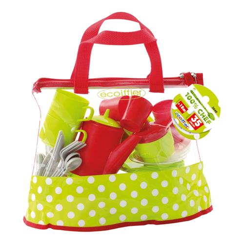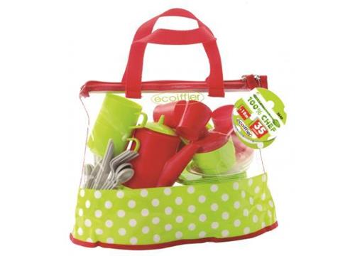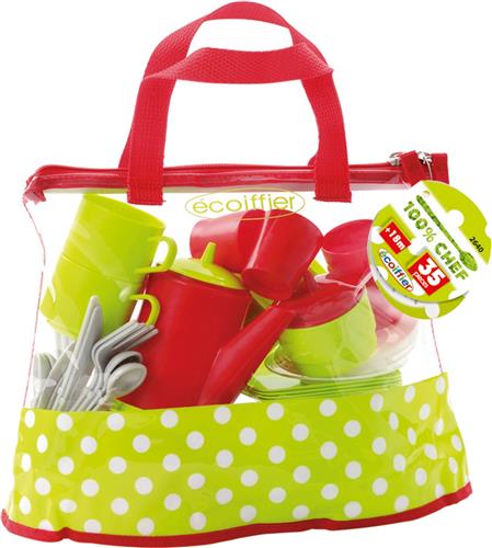 Dit 35-delige servies in tas is perfect voor kinderen vanaf 2 jaar oud. De set bevat borden, bekers, bestek en meer in de kleuren groen en rood, allemaal gemaakt van plastic. De verpakking heeft een gewicht van 0.38 kg en de productafmetingen zijn 29 cm breed, 12 cm hoog en 30 cm lang. De veiligheidswaarschuwing geeft aan dat het servies niet geschikt is voor kinderen onder de 2 jaar en alleen mag worden gebruikt onder toezicht van volwassenen.