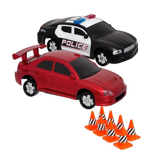 Beleef een unieke race tussen twee auto's in een onderling duel en slalom langs de pionnen. Autorace Bepaal welke auto het het snelste is in een onderling duel. Deze raceset bevat een politieauto en een raceauto voor spannende onderlinge races. Plaats de meegeleverde pionnen op de juiste plek om het nog spannender te maken. Wat is er beter dan op volle snelheid met geluid en sirenes tegen elkaar te racen? Kruip achter het stuur van de politiewagen om de raceauto te achtervolgen of waag je een kans als overvaller om te ontsnappen. De onderlinge races zijn extra spannend!