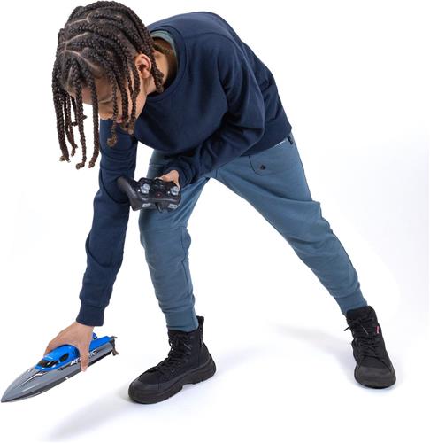 De grootste waterpret vanaf de kade, oever of langs de kant van sloten. Natuurlijk wil je ook niet dat jij of je kind naar de boot moet zwemmen als de batterij op is. De afstandsbediening geeft ruim op tijd aan dat je terug moet varen zodra de accu begint leeg te lopen. Dan is 150 meter immers toch best een afstand.