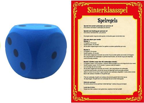 Sinterklaasavond cadeautjes/kadootjes spel met dobbelsteen. bestaande uit 1x Grote foam dobbelsteen blauw 16 x 16 cm, 1x Sinterklaasspel/pakjesspel spelregels SINTSPEL0512.