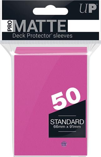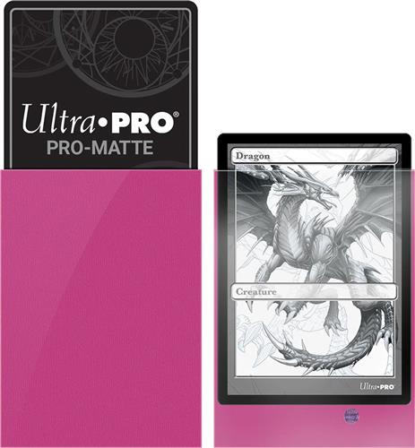 Knalroze Deck Protectors Pro-Matte Non-Glare voor standaard kaarten (66x91 mm). Een pakje bevat 50 deck protectors. Ultra Pro's PRO-Matte Deck Protector sleeves use high-quality materials making them ideal for tournament use. Clear side uses non-glare matte material for a softer feel and smoother shuffle. Stores and protects standard sized cards such as Magic: The Gathering and Pokémon from damage such as bent corners and scratches. Each pack comes with 100 sleeves printed with Ultra Pro's quality hologram seal. All Ultra PRO Protective Sleeves are non-PVC and acid-free, allowing for archival-safe storage. Comes in a variety of different colors. Glare-free, non-reflective sleeves make these Deck Protectors ideal for tournament use Eco-friendly: non-PVC and acid-free design makes them perfect for collectors High-quality, glare-free, matte surface for a softer, more comfortable feel and more natural shuffling Sleeve sizes are 66 x 91mm allowing them to comfortably fit Pokémon, Magic: the Gathering, Dragon Ball Super and other standard size trading cards Each package contains 50 card sleeves