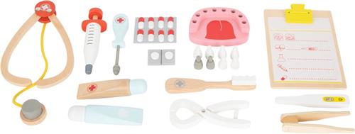 Gaatjes hebben geen kans! Uitgerust met een speelgoedspuit, een boormachine, een tandenborstel, een set verwijderbare tanden, tandpasta en een pincet zorgen ervoor dat er aan deze houten tandartsset niets ontbreekt. De twee grijze tanden leren kinderen hoe belangrijk mondhygiëne is! Met de thermometer, het klembord, de zalf, het pincet en de tabletten is deze set ook prima te gebruiken als speeldokterskit. De stabiele koffer en alle medische instrumenten maken indruk met veel natuurlijk behandeld hout en kindvriendelijke ontwerpen. Perfect voor rollenspellen en om kinderen voor te bereiden op hun eerste bezoek aan de tandarts of dokter, want er zit alles in deze speelset wat je nodig hebt voor een actief rollenspel in de omgang met patiënten! Door in de rol van arts te kruipen en voor patiënten te zorgen, wordt de creativiteit wakker en wordt het zelfvertrouwen van kinderen versterkt. Alle accessoires passen in de ruime houten kist. Met deze speelset kan de tandarts- of dokterspraktijk aan huis geopend worden!