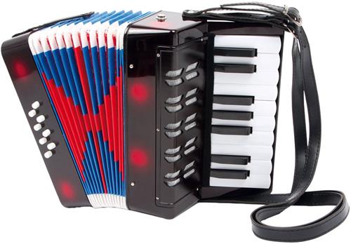 Een nieuw ontwerp voor een van de populaire instrumenten in het assortiment brengt de wereld van muziek naar de kinderkamer! De verstelbare schouderbanden zorgen ervoor dat kinderhanden het accordeon niet hoeven vast te houden, waardoor ze zich volledig kunnen concentreren op het spelen van de muziek. Dit bevordert de ontwikkeling van fijne motoriek op een speelse en artistieke manier. Het glanzend gelakte accordeon is voorzien van extra toetsen die zorgen voor een nog grotere variatie aan harmonieën en luisterplezier.