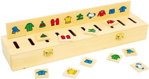Deze fraaie kist met 5 insteeklijsten en 50 symboolplaatjes is een houten spel voor de oefening van de vorm- en kleurherkenning! Op de lijsten zijn geometrische figuren, leuke motieven of cijfers in bonte kleuren afgebeeld. De plaatjes moeten nu op de goede plaats in de sleuven worden gestoken. In 10 vakken met insteekbare scheidingslijsten worden de plaatjes verzameld en 2 snapsloten houden het deksel goed dicht.