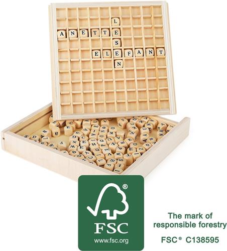 Met de mooie houten opbergdoos met ongeveer 145 letterblokjes, compleet met inlegbord, kunnen kinderen hun eerste woordjes maken. Met deze letterdobbelstenen van FSC® 100% gecertificeerd hout oefenen ze zo het alfabet en het spellen van woorden. Dankzij het inlegbord blijven de blokjes waar ze horen en raken ze niet kwijt. Alles kan gemakkelijk worden opgeborgen in de houten kist en vervoerd worden.