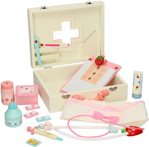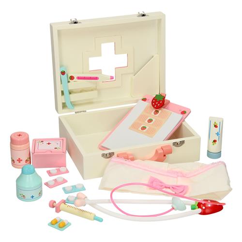 Stap in de wereld van de medische zorg met de Small Foot - Dokterskoffer Isabel! Deze prachtige houten dokterskoffer is perfect om een echte dokter na te spelen. Open de koffer met de stoere metalen sluiting en begin je avontuur. Met de stethoscoop, koortsthermometer, spuit, kap, zalf, pleister, tabletjes en diverse verbandjes ben jij de held van de dag en zorg je dat al je knuffels en poppen snel weer beter worden. Door te spelen met deze dokterskoffer wordt de fantasie van kinderen geprikkeld en worden sociale vaardigheden gestimuleerd.