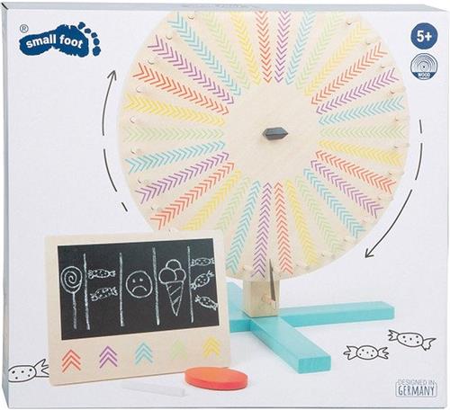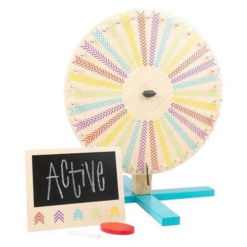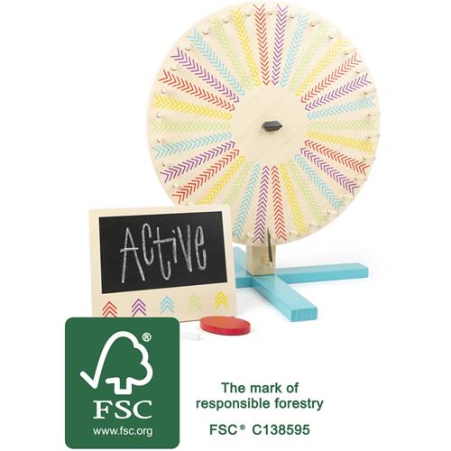 Een winnaar bij elke draai! Dit fortuinwiel gemaakt van FSC 100% gecertificeerd hout bestaat uit een schijf die draait en die gemakkelijk kan worden aangepast. Aan de ene kant zijn er 30 kleurvlakken en aan de andere kant krijtbordverf. Hiermee kun je keer op keer je eigen classificaties maken. De teams en namen kunnen op het kleinere aparte krijtbord worden geschreven en aan het einde kan de winnaar worden gekozen! Dit fortuinwiel is ideaal voor grappige speelrondes in de kinderkamer, of voor wedstrijden op de kleuterschool of op een kinderfeestje!