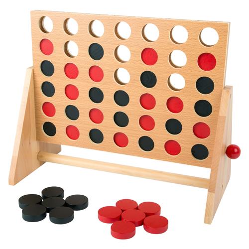 Een grote versie van het bekende klassieke spel voor twee spelers. Dit strategiespel voor jong en oud traint op speelse wijze het logisch denken! Wanneer twee spelers tegen elkaar spelen en proberen vier stenen in een horizontale, verticale of diagonale rij te plaatsen, is speelplezier gegarandeerd! Wie heeft als eerste een rij vol? Zodra het spel afgelopen is, kan het spelframe op zijn kop worden gezet zodat de stukken er weer uit vallen en de herkansing direct kan beginnen!