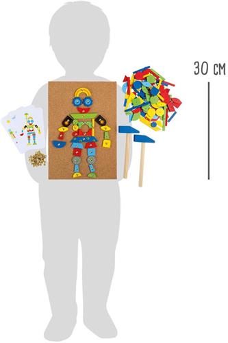 Luister naar wie er hamert! Een elastische kurkplaat, twee kleine houten hamers, 100 kleine spijkers en 126 kleurrijke houten onderdelen geven het startschot om een individueel beeld te creëren. Met 6 fotosjablonen en opbergdoos! Er zijn hier geen grenzen aan de verbeelding. Of het nu robot, trein of raket is, hier is alles mogelijk. Wie nog op zoek is naar ideeën, pak gewoon de zes fotosuggesties en gaat aan de slag!