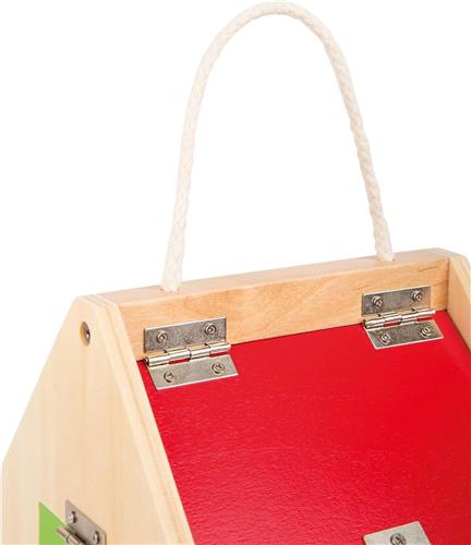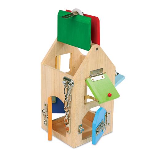 Een houten huis met diverse grendels, hendels, sloten en een veiligheidsketting. Elk deurtje of raam sluit op zijn eigen manier! Met dit huis kunnen kinderen de alledaagse motorische vaardigheden trainen. Maar wees voorzichtig! Hier worden de lieve kleintjes grote uitbrekers!