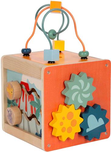 De activiteitenkubus heeft vijf verschillende speeloppervlakken met onder andere kralendoolhoven, een vormpasspel, schuifdoolhof, spinnend tegelspel en tandwielen. Door te spelen met de vriendelijke dinosaurussen, palmbomen en vulkaan worden de fijne motoriek en de nieuwsgierigheid van kinderen gestimuleerd. Een geweldige manier om spelenderwijs te leren!