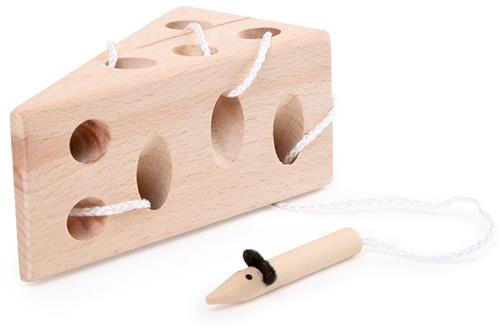 Wie heeft er door de kaas zitten knagen? Het kleine muisje natuurlijk! Dit mooie rijgspel van helder gelakt, FSC® 100% gecertificeerd beukenhout zal de motoriek en het geduld trainen. Met een beetje behendigheid kan dit kleine muisje speels en gemakkelijk door het stuk kaas worden geregen, waarbij de fijne motoriek van de vingers wordt getraind.