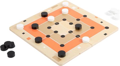 De twee klassieke spellen Nine Men's Morris en Solitaire maken indruk met hun elegante, moderne look en zijn gegarandeerd blikvangers voor de volgende spelavond! Bijzonder aantrekkelijk zijn de verfijnde goudaccenten in combinatie met terracottakleur, helder zwart/wit en natuurlijk hout. Het 2-in-1 speelbord is opgedeeld in twee delen zodat het ruimtebesparend kan worden opgeborgen. De geïntegreerde magneten zorgen ervoor dat de twee helften van het bord bij elkaar blijven. Wordt geleverd met hoogwaardige speldoos voor opslag. Een door en door stijlvol gezelschapsspel in een onopvallende designerlook. De speelstukken van massief hout voelen prettig aan tijdens het spelen.