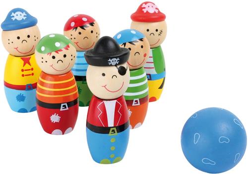 Rustig aan doen? Nee helemaal niet - het doel is om een strike te gooien. Met volle vaart de mini houten pins met de houten kogel omgooien. Zes piraten staan klaar om te worden afgeschoten en wachten op de kogel. Alle kegels zijn van hout gemaakt.