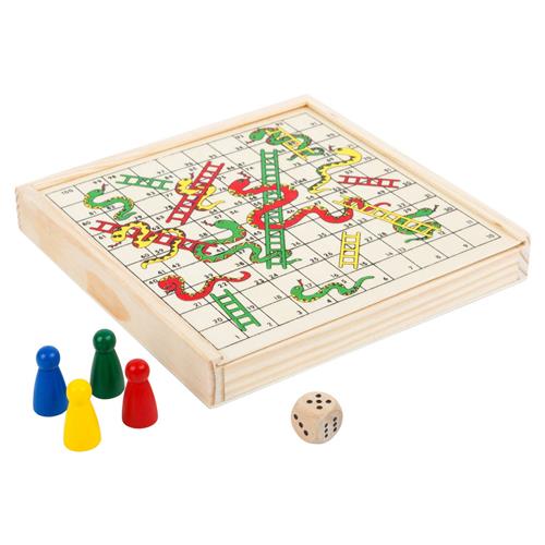 Een leuk spel voor onderweg! De ogen van de dobbelstenen geven aan hoeveel stappen iedereen mag zetten. Met een ladder of een slang wordt het pad ingekort of verlengd. Dit compacte bordspel gemaakt van hout is perfect voor onderweg en onderweg!