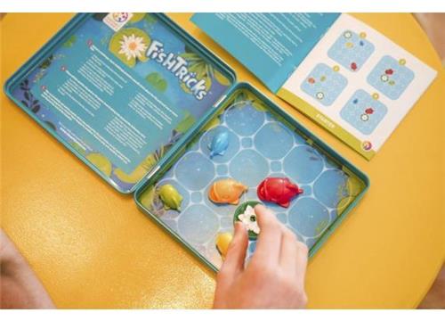 Het doel van Fish Tricks is simpel maar uitdagend: rangschik de vissen van groot naar klein, zodat elke vis zijn kleineremaatje volgt. Pak een opdracht uit het boekje, plaats de vissen op het magnetische bord en probeer de puzzel op te lossen. Met zijn unieke ontwerp en tactische elementen stimuleert dit spel de cognitieve vaardigheden zoals concentratie, logisch denken en probleemoplossend vermogen.