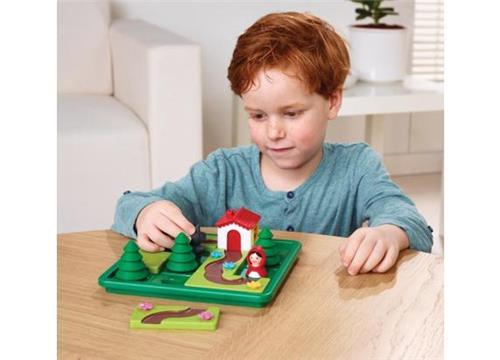 Ontdek de magie van dit klassieke sprookje met dit originele denkspel van Smart Games, speciaal voor de allerkleinsten. Deze Deluxe versie bevat ook een prentenboekje met het verhaal in een eigentijds jasje. Kan jij Roodkapje helpen om de weg naar grootmoeders huis te vinden? Geschikt voor kinderen van 4-7 jaar. Zet Roodkapje, grootmoeders huis en de bomen op het spelbord en gebruik de puzzelstukken om een weg van Roodkapje naar het huis te maken. Kan je alle 24 opdrachten oplossen? Je kan het spel ook spelen met de wolf erbij, maar let op want hij zal eerst bij het huis zijn! Probeer deze 24 andere opdrachten op te lossen door twee wegen naar het huis te maken, één voor Roodkapje en één voor de wolf.