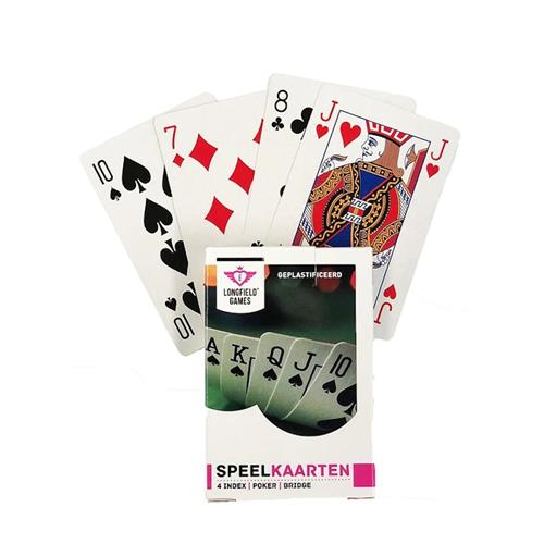 De Longfield geplastificeerde speelkaarten zijn perfect voor urenlang speelplezier. Deze set speelkaarten heeft een standaard poker/bridge formaat en is voorzien van 4 indexen, waardoor ze ideaal zijn voor verschillende kaartspellen. Het kunststof materiaal zorgt ervoor dat de kaarten duurzaam en slijtvast zijn, waardoor je er lang van kunt genieten.
