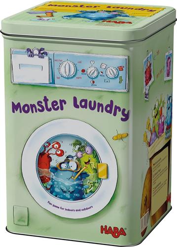 In de Monsterwaskeuken is het altijd een vrolijke boel! De monsters willen namelijk van hun onfrisse geurtje af en daarom wordt er flink geschrobd, gespat en geplensd. Het is een ware chaos! Maar wie durft zich midden in het gewoel te storten en orde te scheppen? Alleen de snelste spelers kunnen hun weg vinden en de meeste gouden wasknijpers verzamelen. De Monsterwaskeuken bevat 48 monsterkaartjes met verschillende monsters in verschillende kleuren. Daarnaast zijn er 40 wasknijpers, waarvan 8 per kleur, en 12 gouden wasknijpers. Het spel wordt compleet geleverd met een elastische waslijn en een handleiding. Het spel is geschikt voor zowel binnen als buiten en wordt geleverd in een megacoole wasmachineverpakking in blik. De Monsterwaskeuken is een bewegingsspel en reactiespel voor spelers vanaf 7 jaar. Het kan gespeeld worden met 2 tot 5 personen en heeft een speelduur van ongeveer 15 minuten.