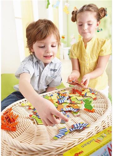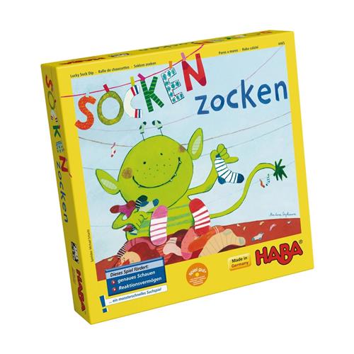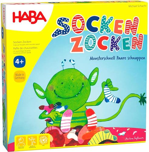 Het sokkenmonster is weer eens bezig geweest in de klerenkast! Wie kan in deze chaos de sokken vinden die bij elkaar horen? Snel woelen de kinderen tegelijk in de berg sokken. Verduiveld, alle sokken lijken op elkaar! Wie vindt de meeste paren? Dit spel van Haba, genaamd Sokken zoeken, is een leuk denkspel voor kinderen vanaf 4 jaar. De verpakking bevat 1 Sokkenmonster, 48 sokken (24 paar), 13 wasknijpers en een handleiding in het Duits, Nederlands, Frans, Engels, Italiaans en Spaans.